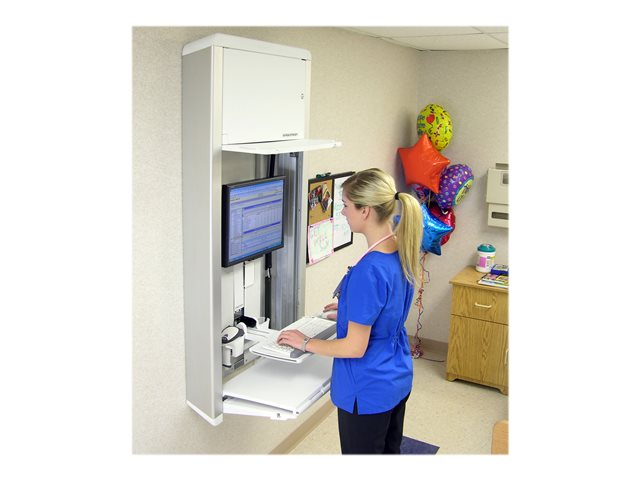 Station de travail sûre, complète et compacte. Idéal pour les chambres dont l'espace est réduit, ce système d'ajustement vertical discret propose un ajustement sans effort de 23 cm et se replie en une unité mince et compacte lorsqu'il n'est pas utilisé. Son mécanisme de verrouillage sans clé permet de protéger les données du patient et d'ainsi respecter les exigences en termes de confidentialité.