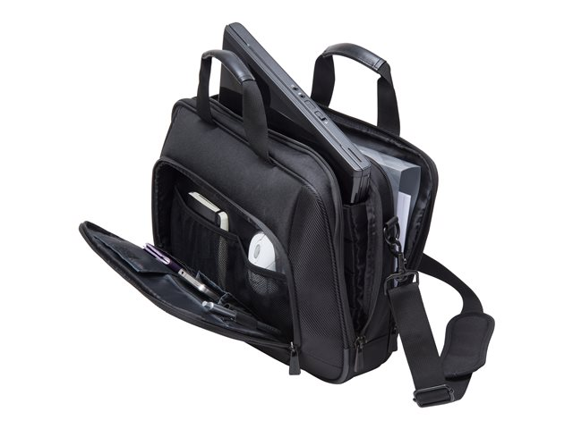 Votre ordinateur portable dispose d'une triple protection: le rembourrage en mousse à haute densité, la sangle de serrage élastique et la doublure extra douce en nylex. Le compartiment matelassé pour iPad ou d'autres tablettes protège en cas de chute et dispose d'une doublure en nylex. Espace de rangement supplémentaire pour vos documents et accessoires mobiles dans le compartiment principal spacieux verrouillable et le compartiment pour documents sur l'arrière de la sacoche. Les compartiments pratiques et confortablement accessibles dans la poche frontale organisent vos objets personnels comme les crayons, cartes de visite, papiers d'identité ou téléphones portables. La poignée confortable, la sangle matelassée aux épaules réglable en longueur et la lanière de fixation assurent un confort maximal lors de vos déplacements. Voilà une solution de transport agréable!