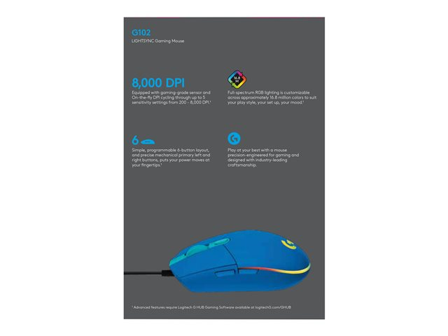 Description du produit Souris de jeu Logitech G102 LIGHTSYNC - souris - USB - bleu Type de périphérique Souris Technologie de connectivité Filaire - USB Couleur Bleu Orientation Pour droitiers Dimensions (LxPxH) 6.215 cm x 11.66 cm x 3.82 cm Poids 85 g Technologie de détection de mouvements Optique Nombre de boutons 6 Résolution 8000 dpi Performances Temps de réponse 1 ms, temps de réponse : 1 000 Hz, commutation de la sensibilité en temps réel 200 - 8000 ppp Jeu Oui Caractéristiques 6 boutons programmables, processeur ARM 32 bits, technologie LIGHTSYNC Longueur du câble 2.1 m Système d'exploitation requis Google Chrome OS, Microsoft Windows 7 ou ultérieur, Apple MacOS X 10.10 ou plus récent Garantie du fabricant Garantie de 2 ans -