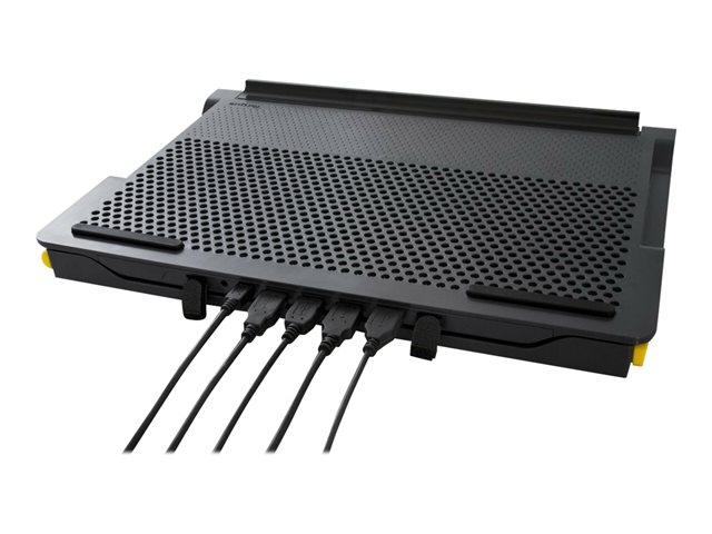 Un support ventilé compact pour votre ordinateur portable. Transformez votre ordinateur portable en station de travail avec le Targus Chill Mat+ hub à 4 ports. Les deux ventilateurs refroidissent votre ordinateur portable, un hub à 4 ports vous permet de connecter tous vos périphériques et le réglage de la hauteur permet de le transformer en support pour ordinateur portable. Utilisez-le à plat ou à hauteur maximale (4") avec un clavier externe pour une meilleure ergonomie.