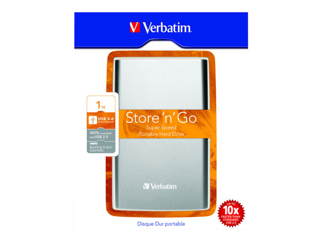 Le disque dur portable Verbatim Store 'n' Go est une solution de stockage hautes performances qui utilise une interface USB 3.0 haute vitesse. La norme USB 3.0 permet d'atteindre des débits multipliés par 10 par rapport à l'USB 2.0 (sur la base de mesure de la vitesse de bus USB), vous offrant un taux de transfert de données ultra-rapide.