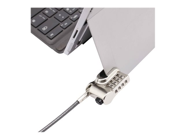 Le câble peut être rapidement fixé au pied du Microsoft Surface Pro et Surface GO et retiré, sans colle ni outils. La sécurité sans clé ni compromis : choisissez votre code personnel à 4 chiffres parmi 10 000 combinaisons possible. Grâce à la fonction "Push-to-lock", le cadenas peut également être verrouillé. Grâce à la bande Velcro pratique, le câble peut être enroulé pour gagner de la place pendant le transport et le rangement.