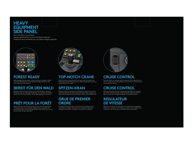 Stick du chargeur avant réaliste.Obtenez la sensation du véritable contrôle sur des véhicules lourds comme les moissonneuses, grues, scies, déchiqueteuses, remorques et plus encore. Le stick du chargeur contrôle les axes vertical, horizontal et rotatif tandis que le commutateur de mode situé en haut du stick double ces commandes en vous proposant six axes.