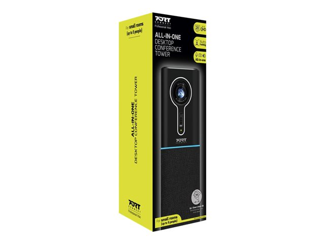 La tour de conférence de bureau tout-en-un PORT Connect 902004 est conçue pour les petites salles de conférence jusqu'à 5 personnes. Elle est équipée d'une caméra haute résolution jusqu'à QHD 2K pour être mieux vu. Restez concentré sur votre interlocuteur grâce à la fonction de cadrage automatique. La molette de défilement verticale vous permet de choisir l'inclinaison et d'adapter le cadrage de la salle. Gardez facilement le contrôle de vos communications grâce aux commandes tactiles et aux indicateurs LED. Ultra-mobile, vous pouvez facilement transporter votre caméra grâce à l'étui de voyage inclus. Universelle, elle se connecte par USB à votre ordinateur portable ou de bureau. Aucun pilote requis, l'installation est automatique.